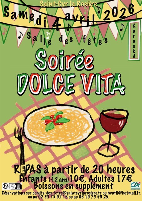 Vous aimez l’ambiance Dolce Vita, les pastas, les vins italiens, le tiramisu, la panna cotta, les tubes d’Adriano Celentano, Eros Ramazzotti et bien d’autres ? Inscrivez-vous à la soirée organisée par le comité des fêtes de Saint Cyr la Rosière le samedi 4 avril à partir de 20h.